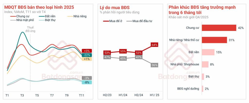 Mức độ quan tâm đối với bất động sản bán tăng đều qua các quý, giá bán tiếp tục leo dốc ở nhiều phân khúc, đặc biệt là chung cư. Đây là phân khúc dẫn dắt thị trường, hưởng lợi từ nhu cầu ở thực lớn và nguồn cung mới thuộc phân khúc cao cấp ngày càng nhiều quanh các tuyến vành đai, metro và đại đô thị.